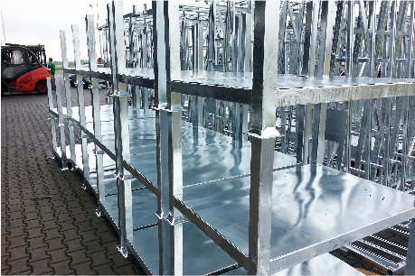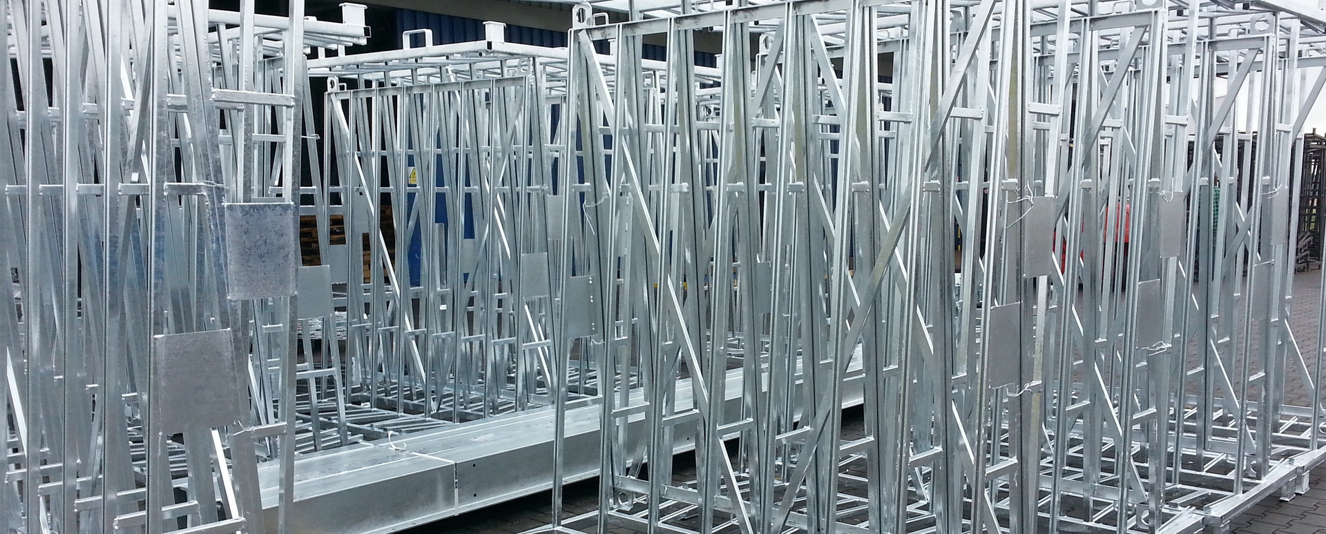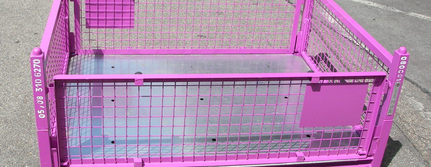 Lagerbehälter, Transport- und technische Metallverpackungen, Körbe, Stationäre und klappbare Stahlträger, Paletten für den Transport von Langgut, Wagen und mobile Plattformen.